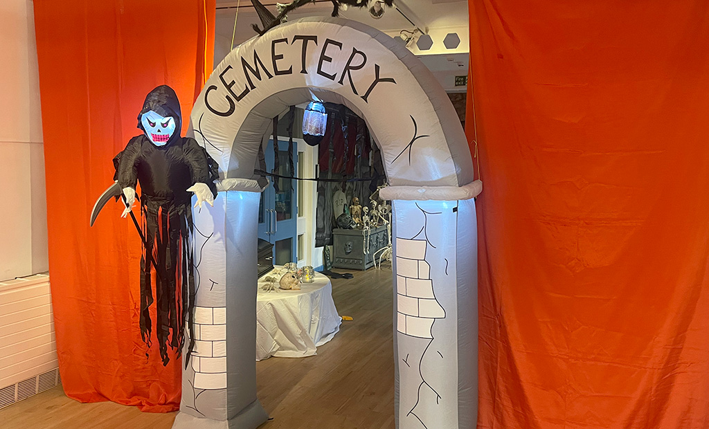 When pupils came to the spooky welcome desk, they immediately saw all the props. I built a coffin with a lid that opens, and a skeleton pops up, inspired by something the headteacher saw at a local steam railway Halloween event.
