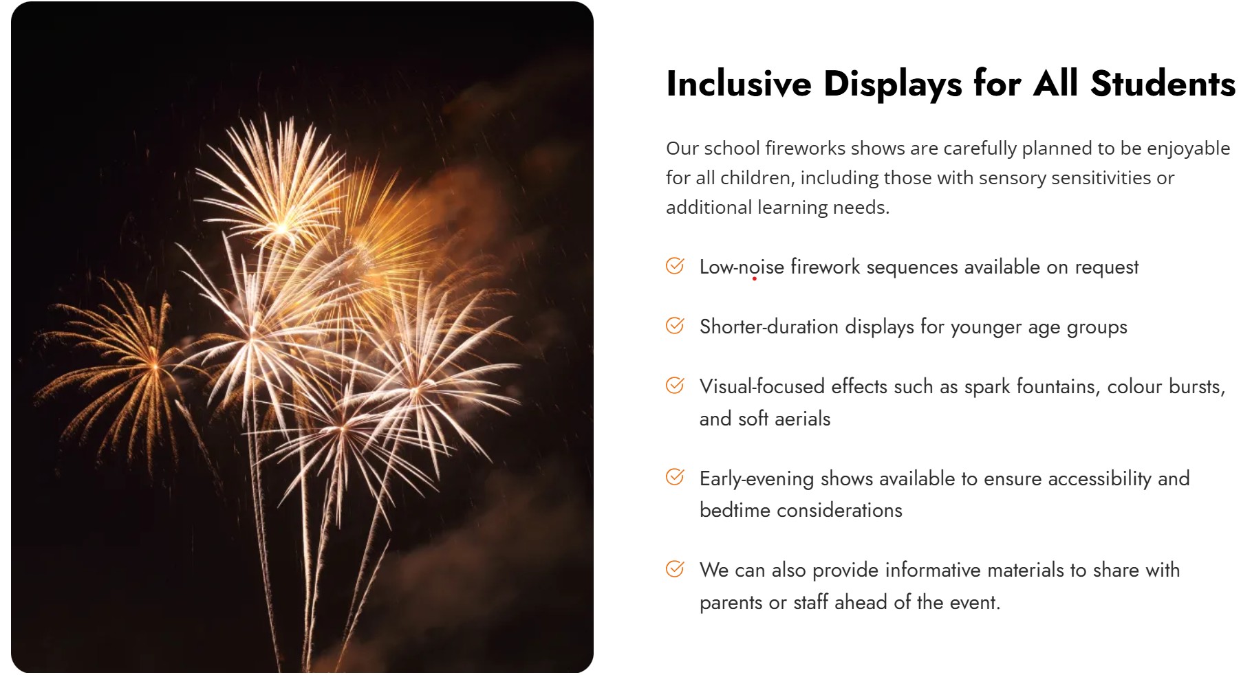 On the night itself, the display was fantastic, we received so many compliments from staff, parents, children and outside visitors. It was far more spectacular than we imagined it could be, given how we had to come down on the price (budget restrictions for our first fireworks event) and completely exceeded all expectations. It was without question one of the best events our school has ever held.